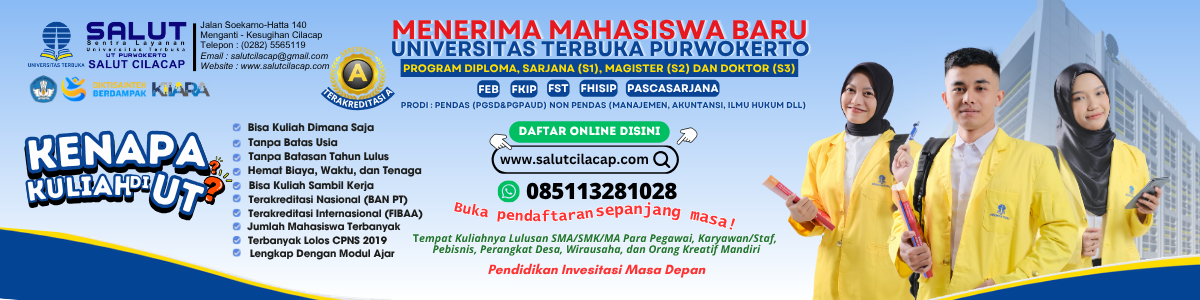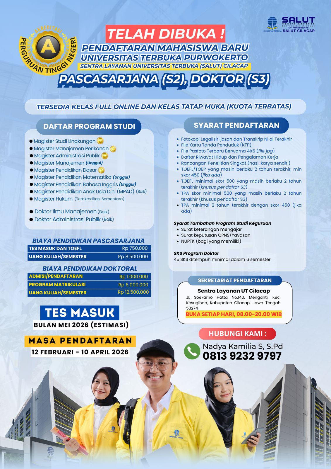 Segera datangi dan daftar Kuliah S2 (Magister) dan S3 (Doktor) di Universitas Terbuka Purwokerto melalui Salut Cilacap. Telah di Buka Kelas Pegawai/Karyawan/Profesional bagi yang bekerja di Salut Cilacap yang beralamat di Jalan Soekarno-Hatta 140 Menganti - Kesugihan - Cilacap. Difasilitasi Bimbingan Tes Masuk dan layanan kemahasiswaan dari pendaftaran sampai Wisuda. Segera daftar sebelum terlambat.