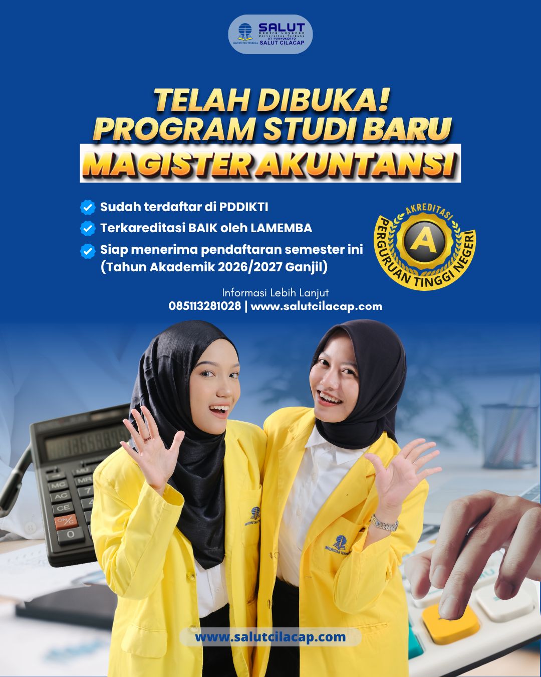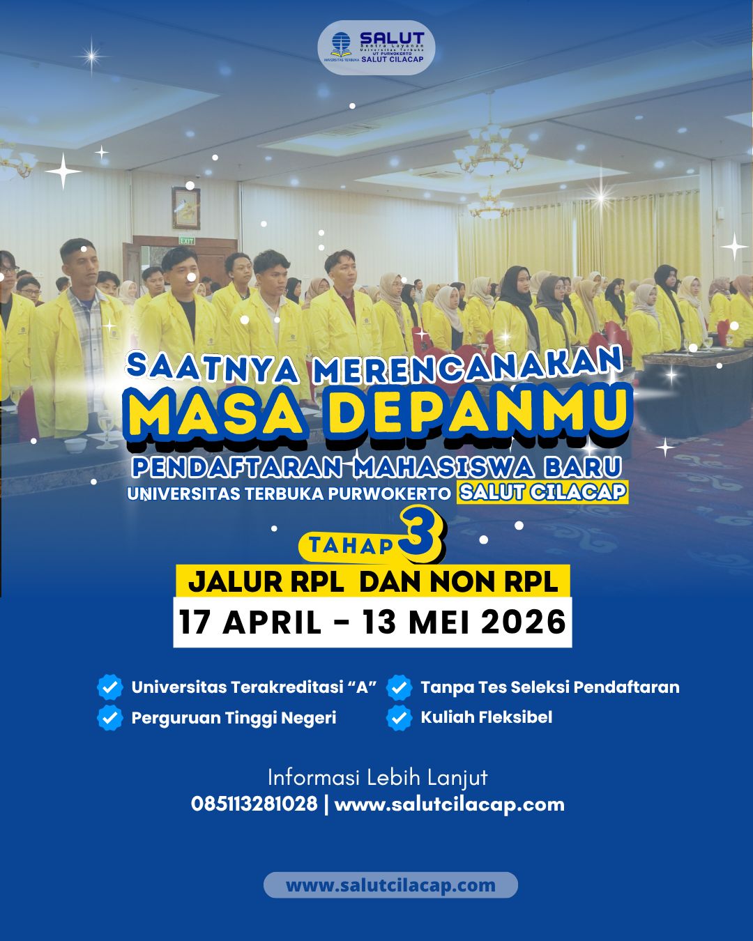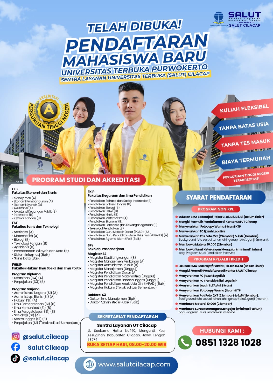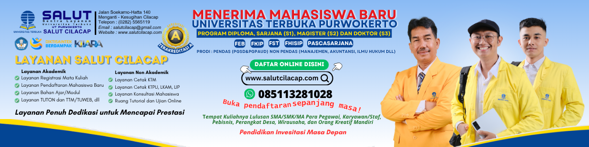 Waktu Pendaftaran Kuliah di Universitas Terbuka Purwokerto Salut Cilacap Setiap Hari Tanpa Libur, Senin s.d Minggu pukul 08.00 – 20.00 WIB, 17 April s.d 13 Mei 2026 di Kantor Sentra Layanan UT – Salut Cilacap atau via website www.salutcilacap.com (online)